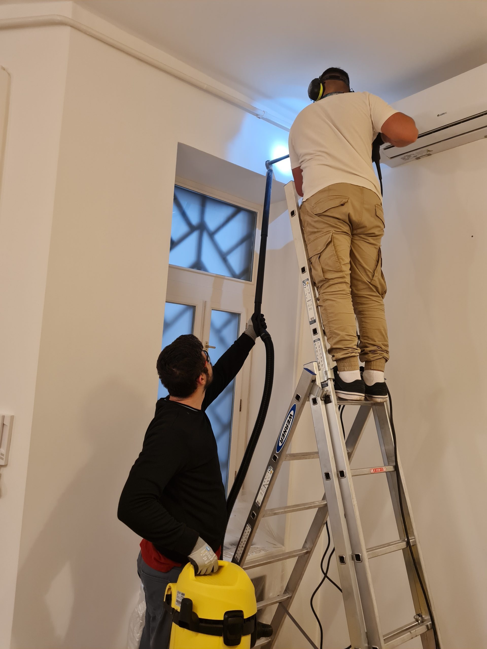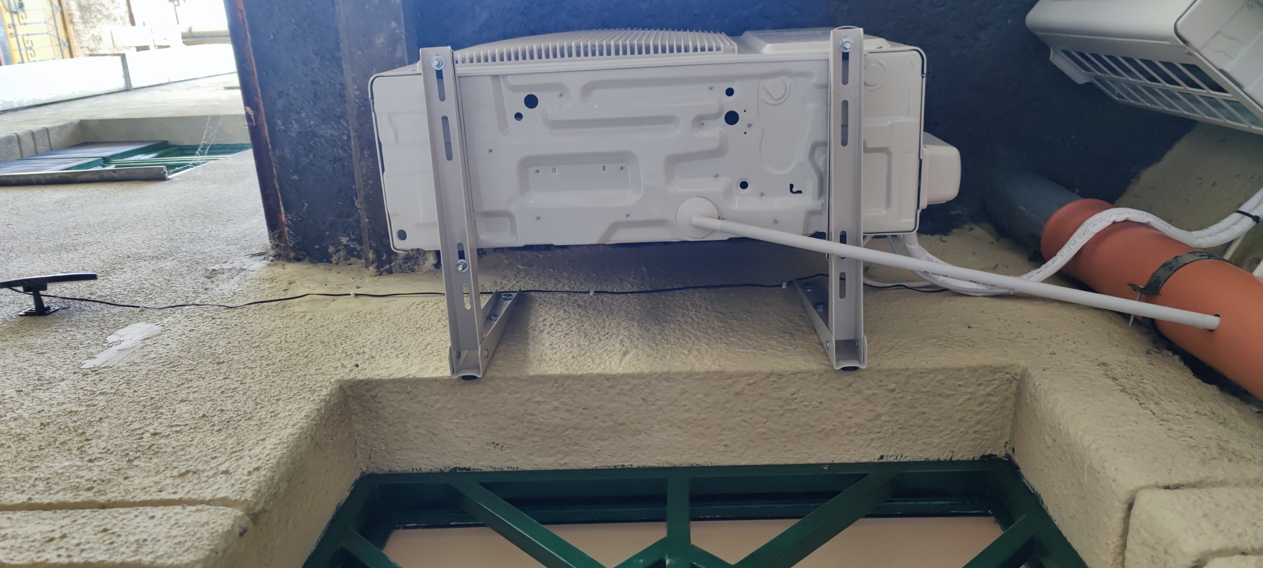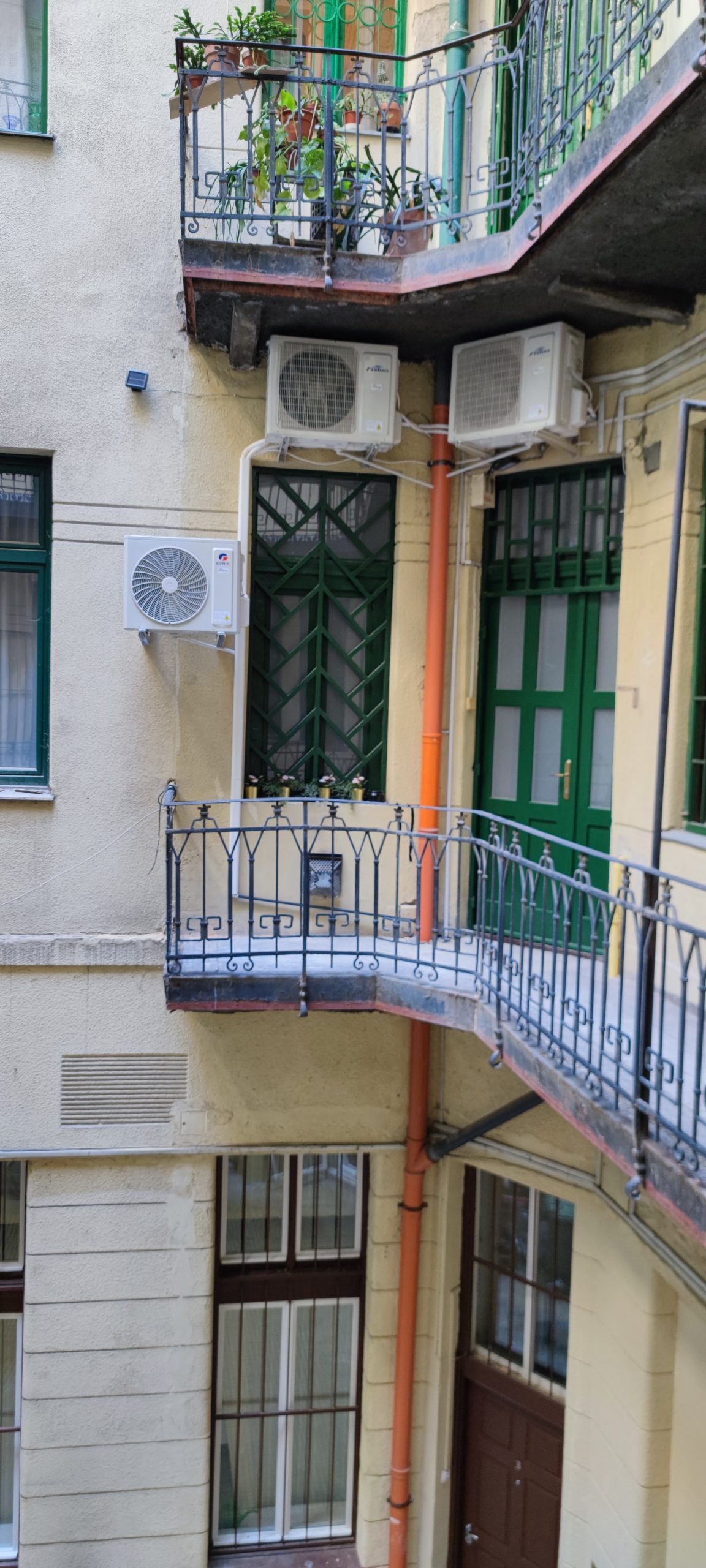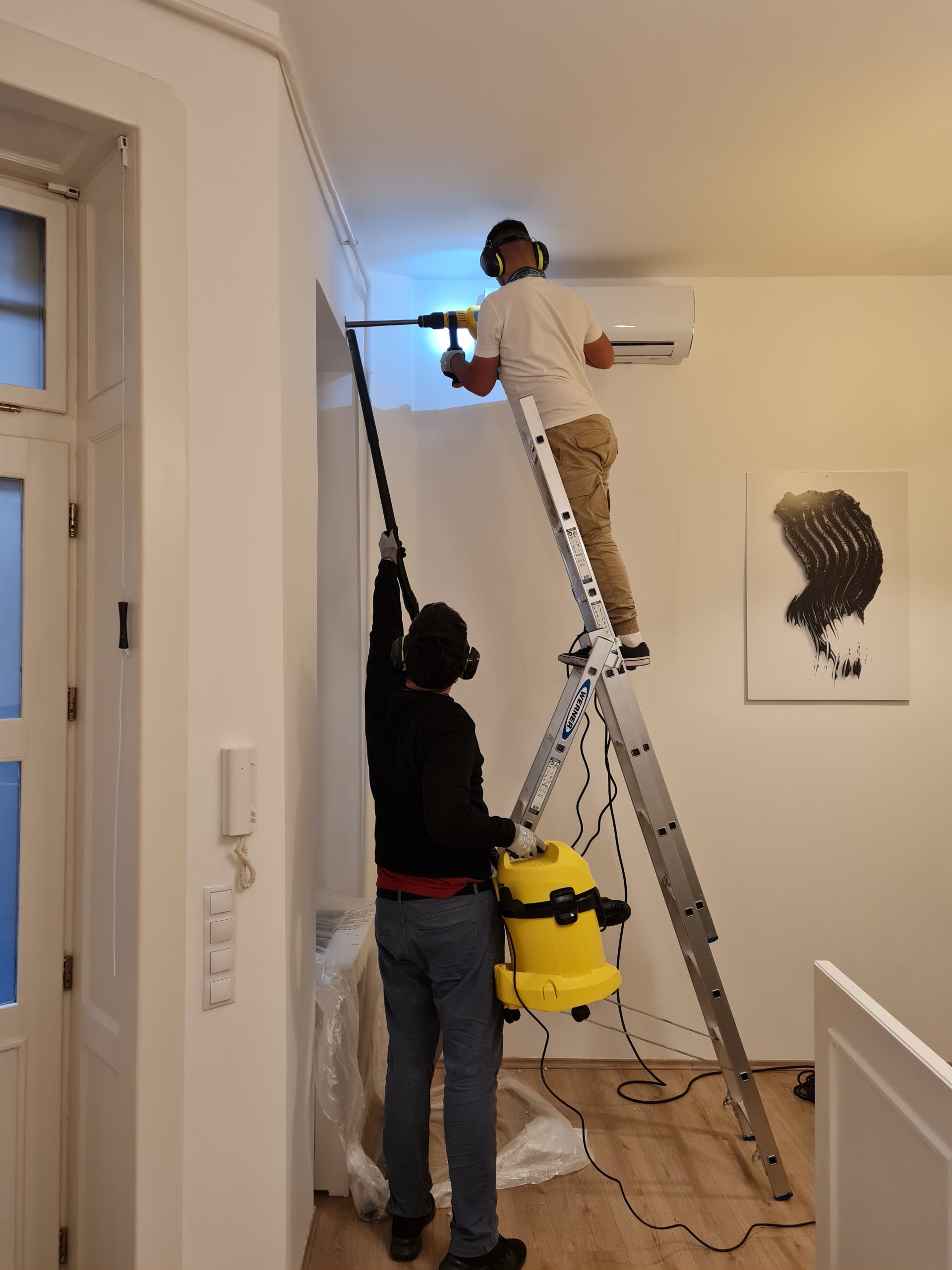 Fűtéskorszerűsítési célból ügyfelünk minden nagy helyiségbe fűtésre optimalizált klímát kért, így három szettet telepítettünk. Körgangos lépcsőház lévén a közös képviselővel egyeztettük a kültéri egységek elhelyezésének lehetőséget. Végül a bejárati ajtó fölé és mellé kaptunk engedélyt. Mivel a két nagy szoba messze volt a külső folyosótól, így  a lakáson belül diszkrét kábelcsatornával végig vittük a csövezést a fali sarkokban,  a kültéri vízelvezetést pedig az ereszcsatorna segítségével oldottuk meg.
